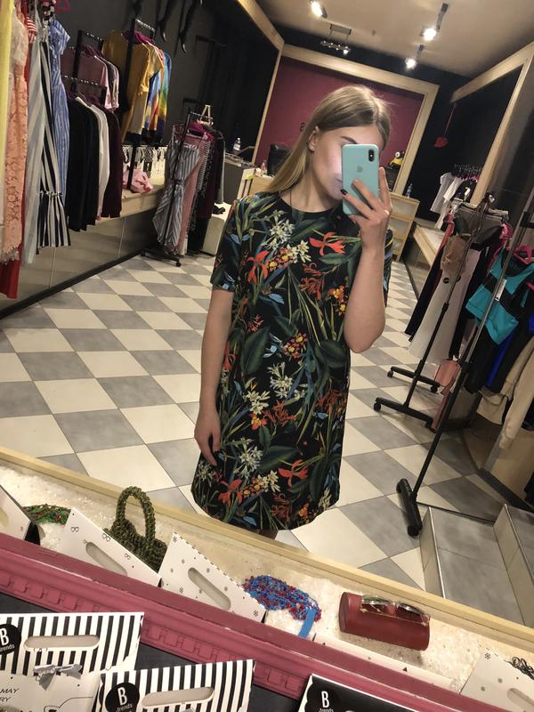 Платье-футболка прямого кроя с ярко флористическим принтом.