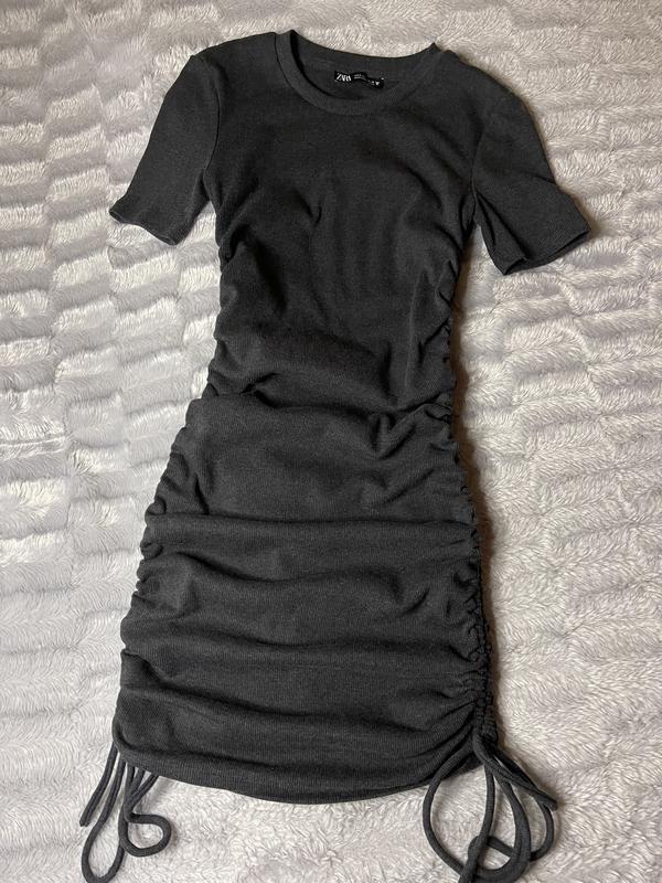 Платье, платье на затяжках, платье по фигуре Затяжки регулируют длину изделия Замеры: плечи полуобхват 34 см Грудь полуобхват 36 см, Талия полуобхват 32 см Бедра полуобхват 36 см Рукав 19 см Длина платья в не стянутом виде 94 см Тканина стрейчева добре тягнеться