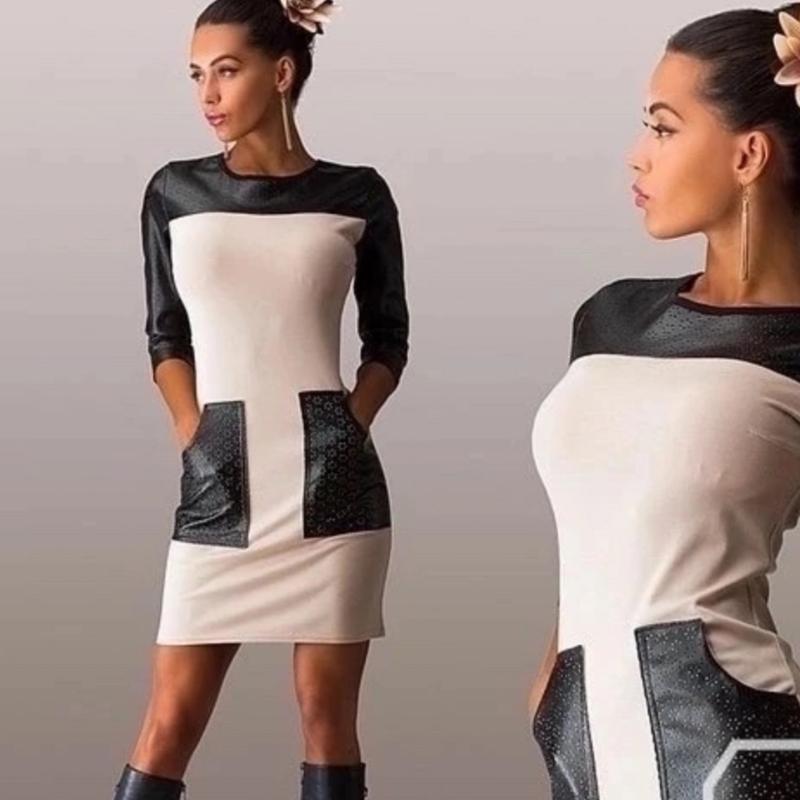 Модель 527 платья новая Цена: 320 гр Размер: 46;48 Ткань: французский трикотаж+перфорированная экокожа, накладные карманы. Длина: 88 см. - 46 - ОГ 94-98 см ОБ 96-100 см - 48 - ОГ 98-102 см ОБ 100-104 см код1705(диа)