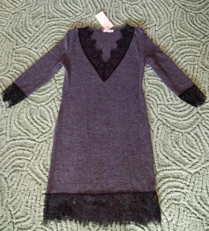 Трикотажное платье серого цвета (меланж) с кружевом. Мини по фигурке