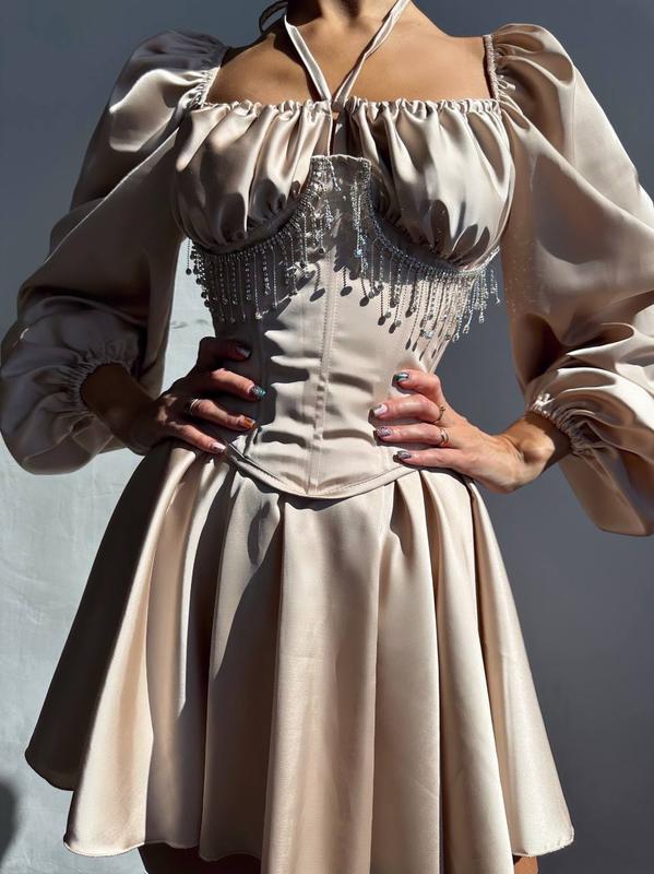 Идеальное атласное платье с корсетом со стразами, платье мини с корсетом атлас, платье мин...