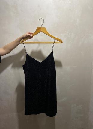 Платье-комбинация в черном цвете, блестящее в свободном фасоне. Подойдет на размер хs, s.
