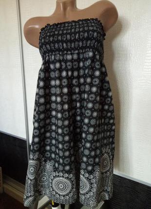Супер легкий сарафанчик из тонкого хлопка. Длина мини. Без брителькой. На груди широкая резинка. Длина 72см Ширина по резинке 30см,тянется до 47-48. От груди в клеш.