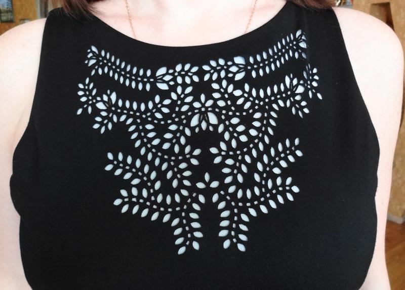 Стильное чёрное платье с выбитым рисунком на груди.