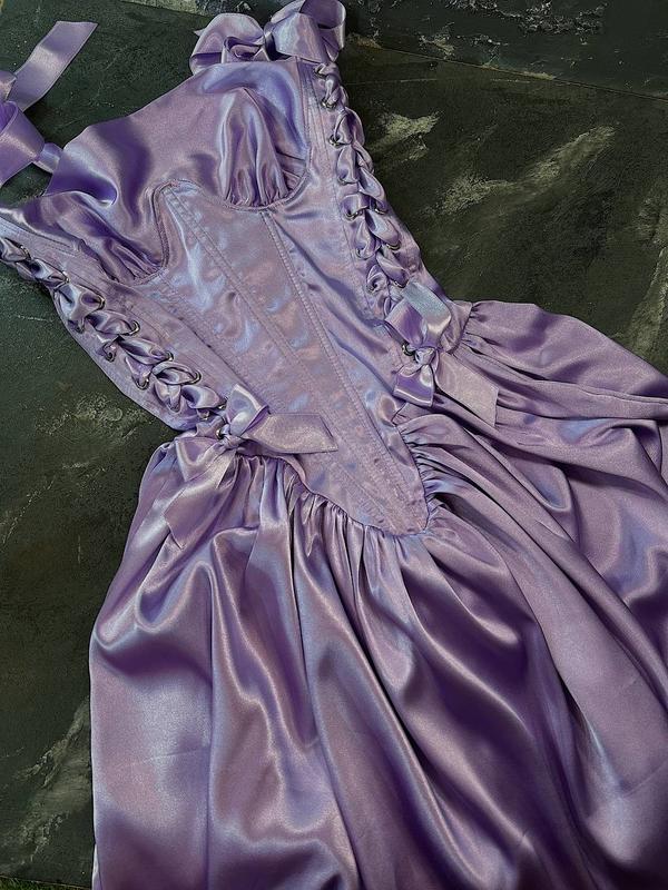 Платье из атласа Голд корсетного типа, на шнуровке по спинке и бокам атласными лентами. Бретели-завязки из атласных широких лент.