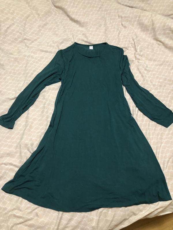Чудесное очень комфортное платье с американского сайта Old Navy. Нежная высококачественная вискоза, не растягивается, не теряет форму. Силуэт трапеция - расклеш от талии. Полотно цельное, шва на талии нет. Красивый бутылочный цвет! Размер L Ширина в плечах 41 ПОГ 50 ПОТ 51 Ширина низа 82 Длина 93 Длина рукава 60 ОЧЕНЬ ХОРОШО ТЯНЕТСЯ! Подойдёт как на размер М, так и на L, XL, XXL, благодаря хорошей эластичности.