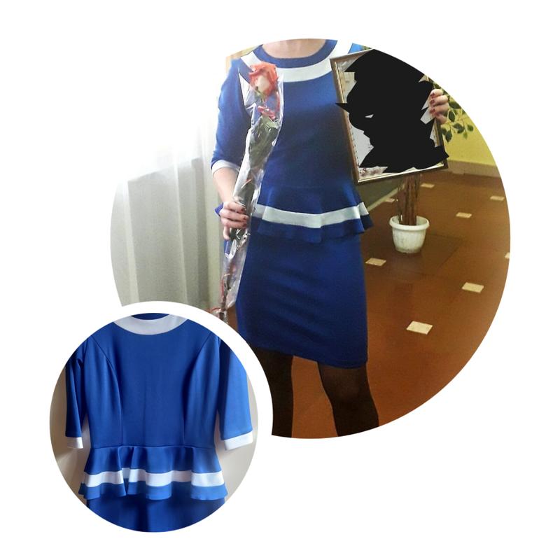 женское платье с баской цвет электрик с белыми вставками. по фигуре. ткань притавляется. на спине закрывается на декоративную молнию. выше колена.