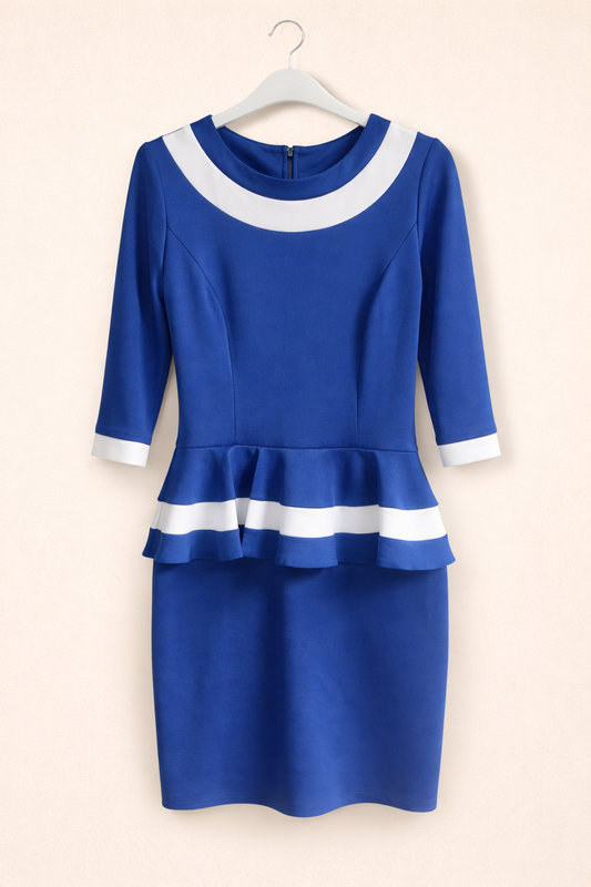 женское платье с модной баской. цвет электрик с белыми вставками. по фигуре. ткань дайвинг тянется на спине закрывается на декоративную молнию выше колена. эффектный размер С/М.