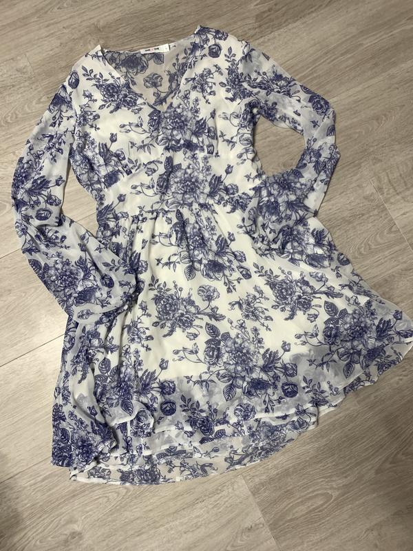 Платье длины мини из искусственного шелка в яркий цветочный принт. Декольте украшено не большим вырезом в виде "галочки". Длинные рукава дополнены резинкой на манжетах, что создает объемный эффект. От талии до низа платье выполнено в расклешенном двухслойном крое разной длины, который придает ей игривость. Имеет легкий хлопковый подклад и фиксируется молнией сбоку. Длина изделия - 90,5 см., Длина рукава - 67,6 см., Ширина по груди - 48 см., Ширина по талии - 38 см