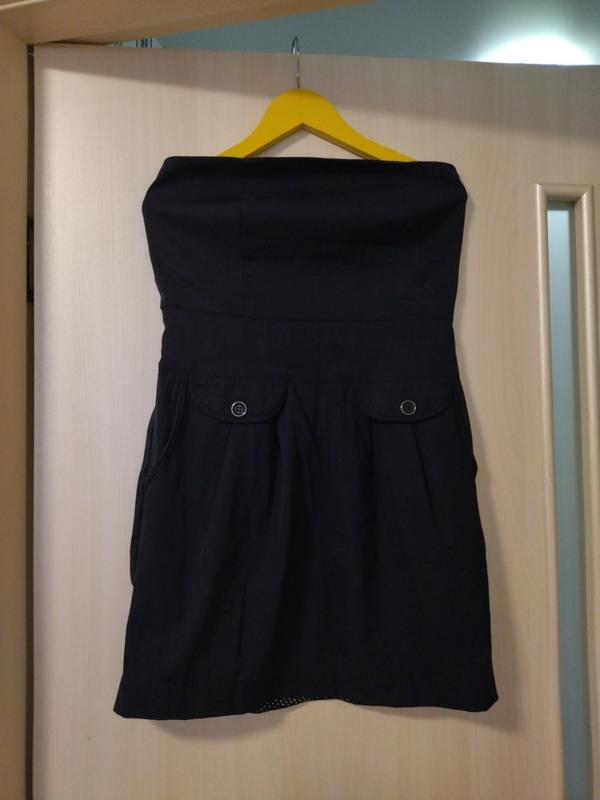 очень классное платье на молнии, снаружи темно синяя, подклад в горох, включает в себя два кармана. Можно носить как самостоятельное платье, а можно и под гольф, рубашку или топ. Кто знает эту фирму, тот знает толк в качестве.