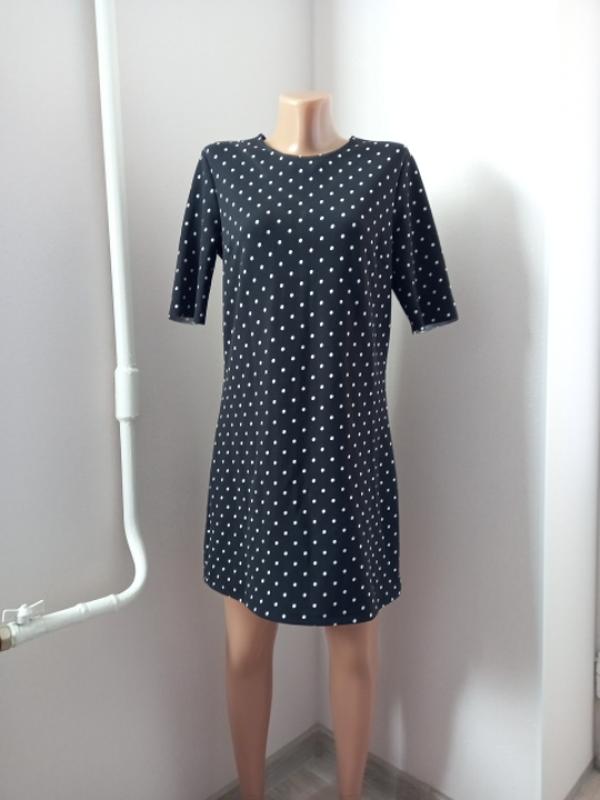 нова сукня в горох,пряма,рукав просто обрізан(така модель).приємний стреч трикотаж. Довжина87,пог40, по стегна 47.Пересилаю після оплати через сайт,або на карту