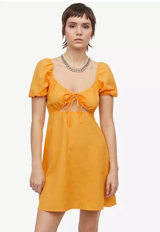 Короткое яркое платье H&M из тканого материала с вырезом в форме сердца, высококачественных формованных чашечками, вырезом и небольшим вырезом на завязках спереди. Короткие рукава-фонарики с узкой резинкой на плечах и по низу, потайная молния с одной стороны, шов под грудью и слегка расклешенная юбка. Состав: Полиэстер 98%, Эластан 2% Размер 16, подойдет на 14-12 новое с биркой ПОГ - 47см ПОТ - 39см ПОБ - 55см Рукав - 25см Длина - 85см