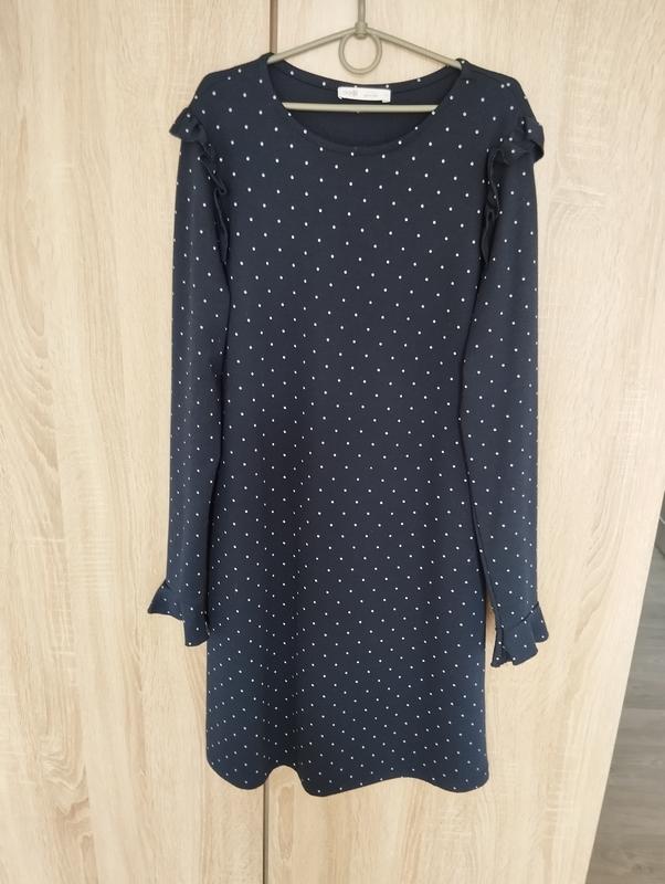 Красивое платье, темно-синий цвет в белый горох. Прямий силует. На рукаве и по плечу оборка.Вказано размер м, можно на s, будет более свободное.