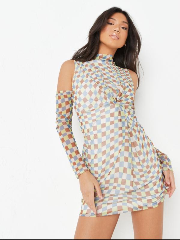 Приталенное мини Платье в сетку от известного бренда Missguided, с открытыми плечами. Имеет подкладку, удлиненный рукав.