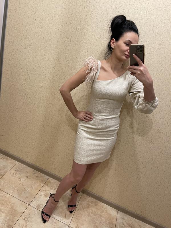 Вечернее платье из ткани жаккард, с золотистыми нитями, декорированное перьями, асимметричный рукав, длина мини Очень красивое, при том, что платье празднично смотрится изящно и элегантно Почти не тянется Размер xs/s У меня рост 168 см, так что длину видна на фото