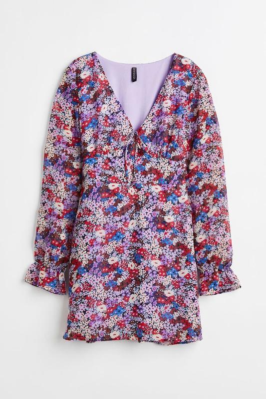 Короткое платье из воздушного шифона с набивным рисунком. Приталенный лиф и нежно расклешенная юбка. V-образный вырез, фигурные чашечки и завязки спереди. Шов на талии с прикрытой резинкой сзади, длинные рукава с узкой резинкой на манжетах и потайная молния с одной стороны. Подол прямого кроя. Частично подложен. Размер XL Замеры: длина изделия 88, длина рукава 66, поп 44, пот 45-49