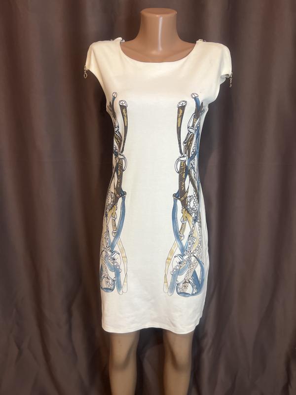 Белое платье с молниями на плечах и узорами вдоль тела, которые визуально будут делать вашу фигуру стройнее)