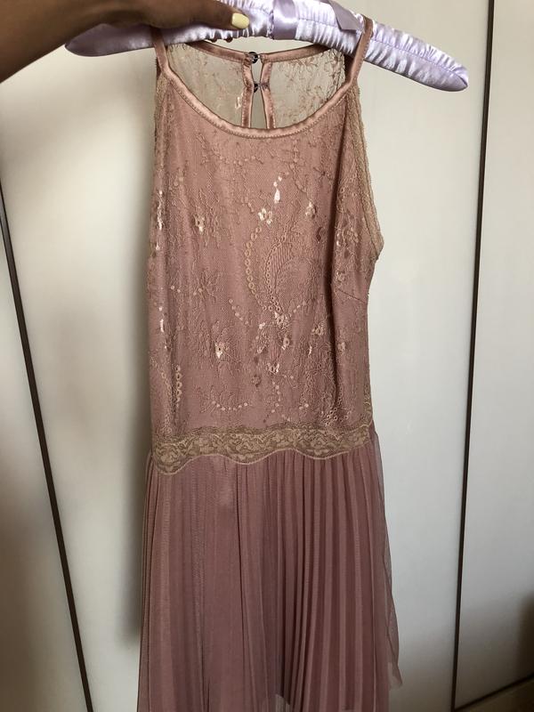 Продам очень красивое платье, пудрово-золотого цвета, ажурный верх, юбка плиссе. Одевалось один раз. На девушку ростом до 165, размер ХС-С.