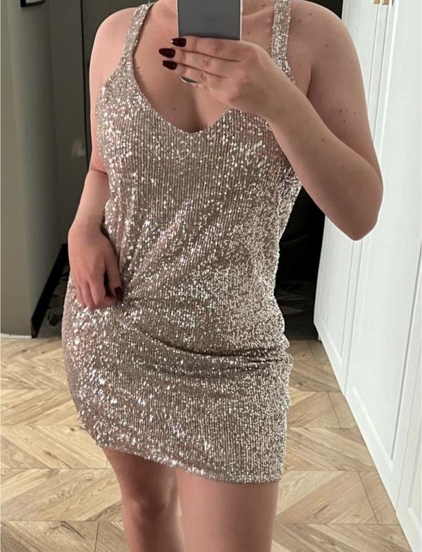 Очень красивое платье мини в пайетках. Сверкает, переливается, цвет молочно-бежевый. Мягкая подкладка. Бренд Pull&Bear. Размер М. Длина 83см. Без недостатков.