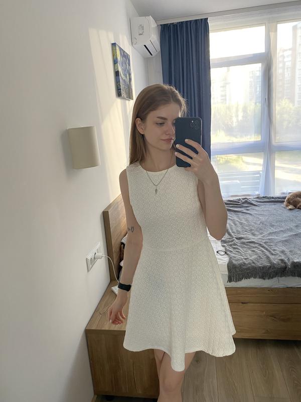 Сукня з цупкої тканини молочного кольору , гарно тримає форму та не втрачає форму після прання ) Сяде краще на розмір с Вдягнула 1 раз на декілька годин Мої параметри на фото: Зріст-167 Талія-60 Груди -87 Стегна-88
