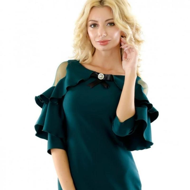 Платье с декоративными элементами в ворота и оригинальными рукавами. Застегивается на потайную молнию сзади. Длина рукава три четверти. Сукня НОВА ТАК ЖОДНОГО РАЗУ НЕ ОДЯГАЛАСЬ. НЕ РОЗТЯГУЄТЬСЯ.