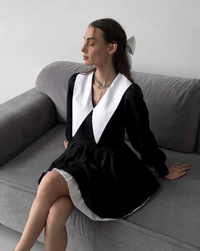 🎀 Сукня 🌸Розміри: 42-44, 46-48 🌸Колір: чорний з білим 🌸Тканина: костюмка+котон Сукня в стилі Wensday закохує з першого погляду. Білі вставки - обманки. Створено з натхненням