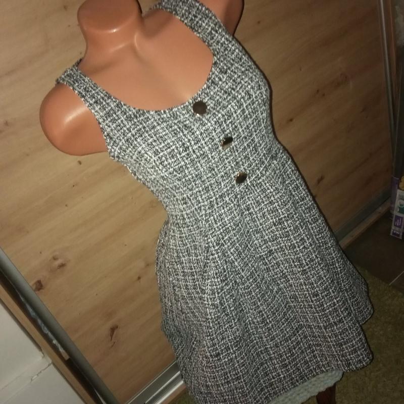 Девичье платье в гусиное звено. На спине имеет молнию для застегивания. В районе декольте имеет декоративные пуговицы. Состояние новой вещи.