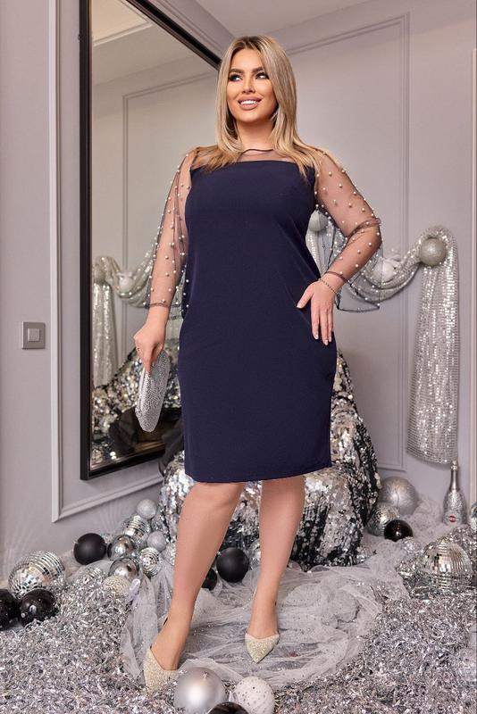 Сукня " з перлинами " # 923 (Ал-Коз) Размеры: 48-50, 52-54, 56-58 Размеры идут спаренные. Тканина: Костюмка диагональ + тонкий фатин + всипано перлинами на рукавах. Фактические измерения: По 52-54 размеру. Длина платья- 106 см. Длина рукава - 53 см. ОГ- 106 см. ОТ- 102 см. ОБ- 118 см. К каждому следующему размеру добавлять + 4см (на одиночные размеры). На спарении + 8см помимо длины изделия. Рост модели на фото 170см. На модели одет 52-54 размер. Параметры модели на момент съемки: БЛОНДИНКА: ОГ: 115 см. ОТ: 90 см ОБ: 120 см. БРЮНЕТКА: ОГ- 106 см. ОТ- 85 см. ОБ- 114 см. Дополнительные характеристики: Платье на прямого покроя. По кокетке спереди идет сетка, на рукавах тоже сетка оформлена жемчужинами. По спинке платья есть потайная молния. Цвета изделия: Черный. Бутилочный. Синий. Марсала. Электрик.