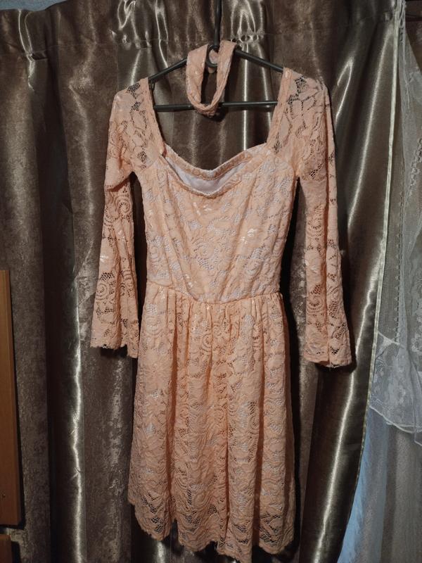 Платье в узор персикового цвета размер 44-46, с чокером на шею, в подарок подъюбник