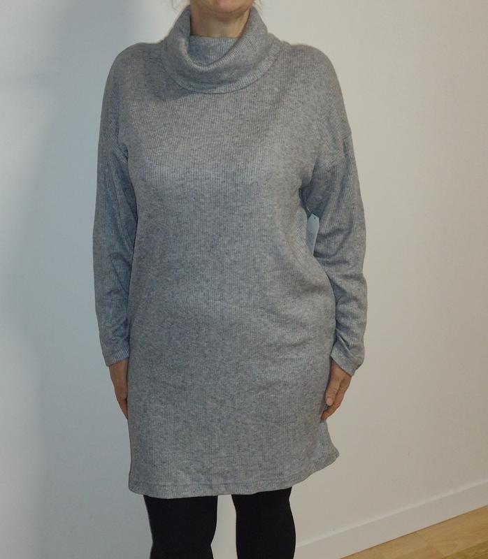 сукня коротка вільного крою, тонкий трикотаж, рубчик. Заміри: довжина виробу 92 см напівобхват грудей 60 см напівобхват талії 56 см напівобхват по низу 57. довжина виробу від горловини до зап'ястя 74 см