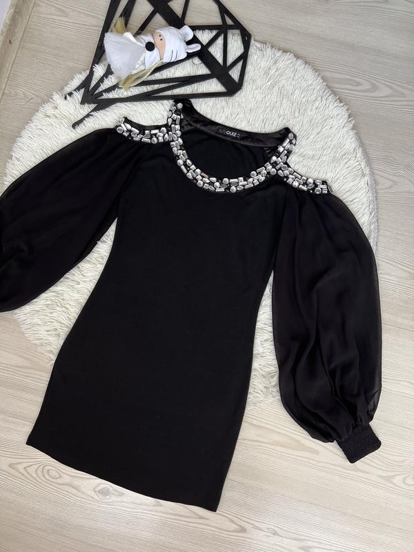 Изысканное мини платье с обнаженными плечами Прозрачные, объемные рукава Расшитые камнями Плотная, натуральная ткань Ста идеален Длина-78 П.о.г-39 Рукав-59 П.о.т-33 П.о.б-38
