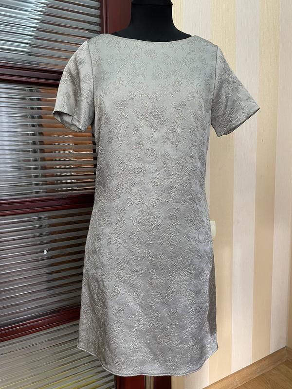 Дуже гарна сукня з мʼякого жакарду в трендовому сірому кольорі з золотим тисненням. Тканина з мʼякою зворотньою стороною, без підкладки Стан ідеальний