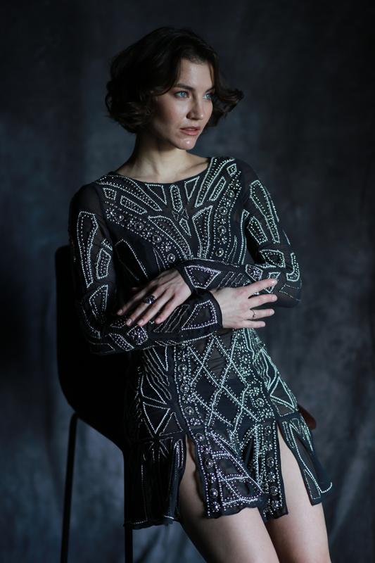вышитое вручную бисером прозрачное платье. короткое платье с длинным рукавом.