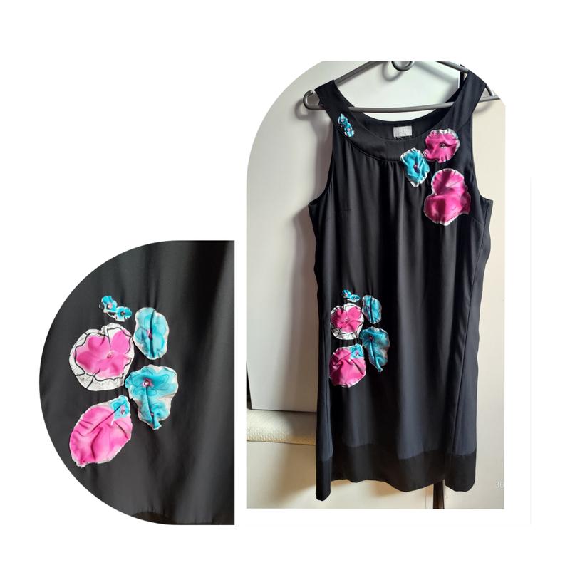 платье с аппликацией. без рукавов. вырез круглый. на подкладке. ткань не тянется, очень красиво стирается. размер С/М. до колена.