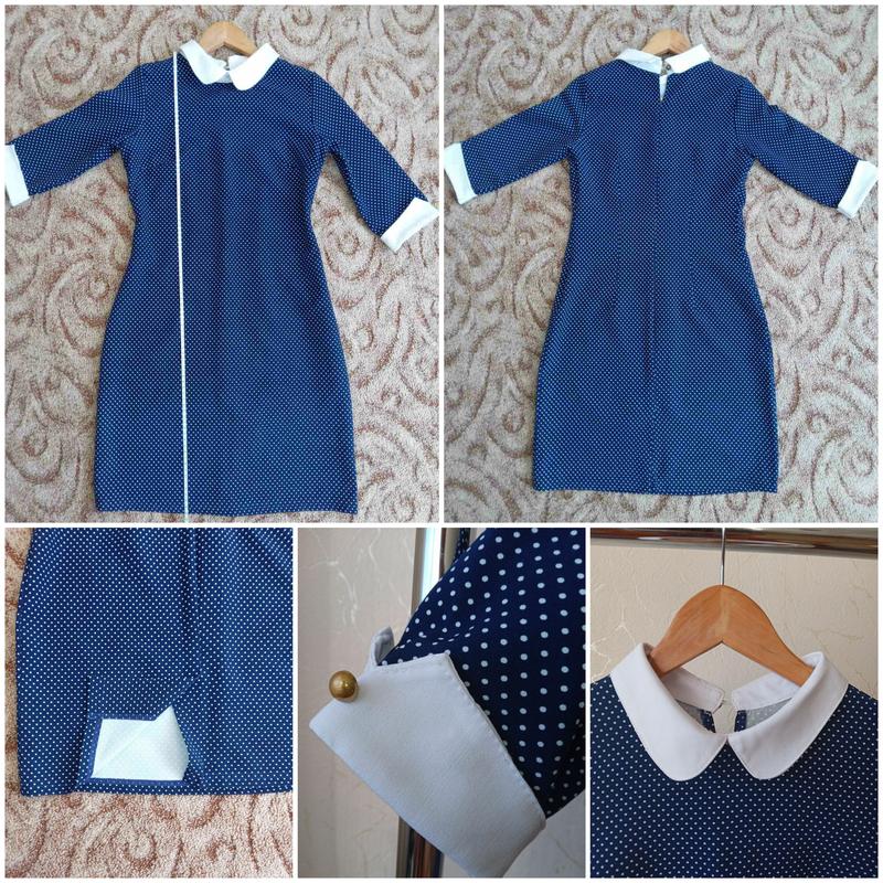Темно-синее платье в мелкий белый горошек с белым воротничком и манжетами на миниатюрную девушку, 42 размер,збока застегивается на молнию, маломерит, качественная ткань чуточку тянется, красиво ложится по фигуре, новое (не носила)
