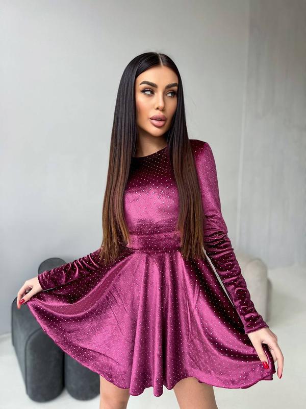 Бархатное мини платье с блестящим напылением с длинными рукавами