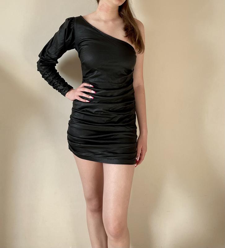Красивое черное платье из трикотажа с напылением под кожу, не парит и эффектно смотрится, размер S ПОТ-33, ПОГ-36, длина от плеча -71 см