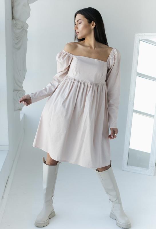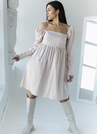 В наличии женское платье очень красивого фасона. Пошито из высококачественной вискозы, очень аккуратный пошив. Красиво сидит по фигуре. Можно носить как со спущенными плечами, так и приподнятыми. В наличии размер М: Длина - 92 см; ПОгрудей - 42 см + 2-3 см Рукав - 65 сантиметри. В наличии в телесном и синем цвете.