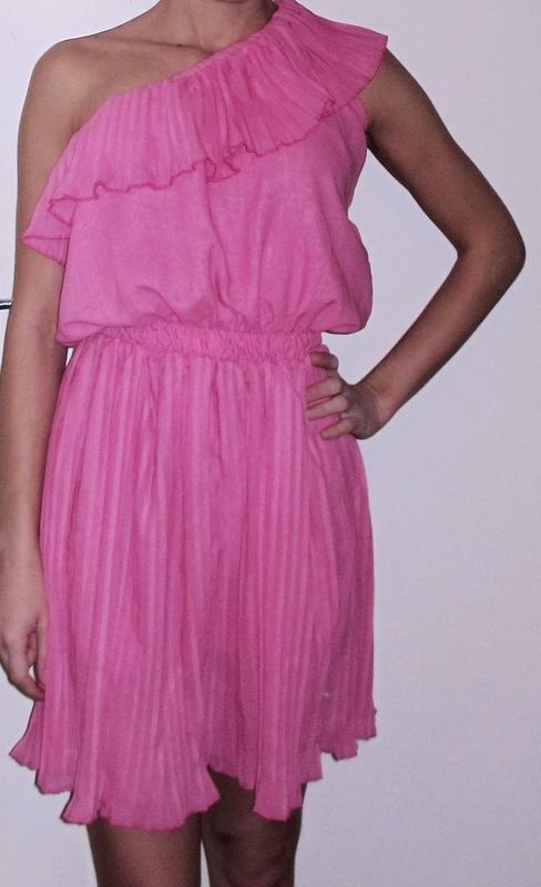 Летнее платье-сарафан, приятного, розового цвета.Юбка плиссе с резинкой на талии. Имеется подкладка. На одно плечо. Размер: S (европ.36) Длина: 80 см Состояние: Отличное!Практически новое.