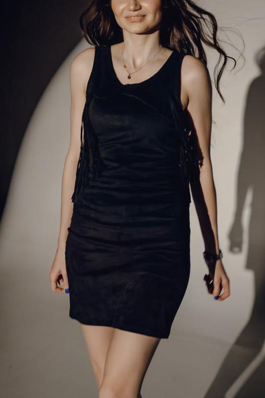 Черное замшевое платье с бахромой по боковым швам. Длина мини. Силуэт обтягивающий. Размер 36. Без пятен. Стан 10/10.