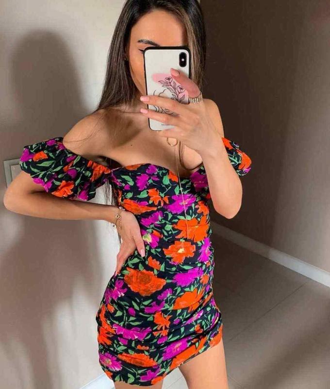 Короткое платье в цветочный принт. Спущенные рукавчики на плече. Очень красиво подчеркивает грудь (можно носить без бюста). Полностью на подкладке Размер XS ПОГ - 42 см ПОТ - 33 см ПОБ - 43-44 см Длина - 70 см Состав: верх 100% вискоза, подкладка - 100% полиэстер