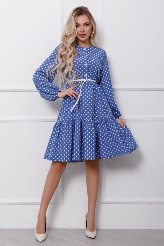 12404_голубой Повседневное платье-трапеция с длиной до колен и свободным расклешенным кроем. Модель выполнена из софта с нижними воланами, длинными рукавами и укороченной планкой на пуговицах. Изделие выполнено из голубого в белый горох софта. Пояс в комплект не входить.