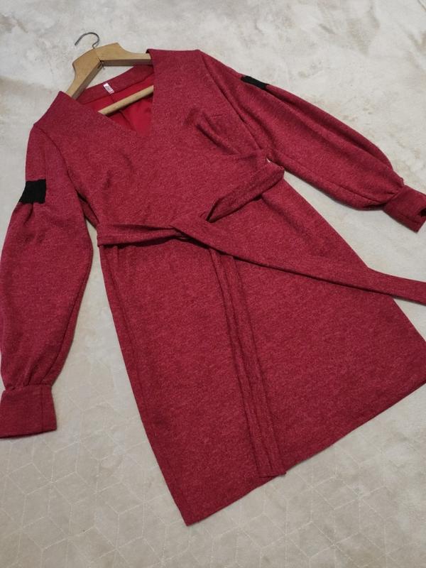 Теплое платье на запах.Ткань, как меланж или ангора.Дозит плотное.В идеальном виде.Одеждалась несколько раз.Пог-47.Пот-42.Поб-48..Довжина-88.Довжина рукава от шеи-72.Ширина спинки-34.В идеальном состоянии, без катышек.достатко тянется.