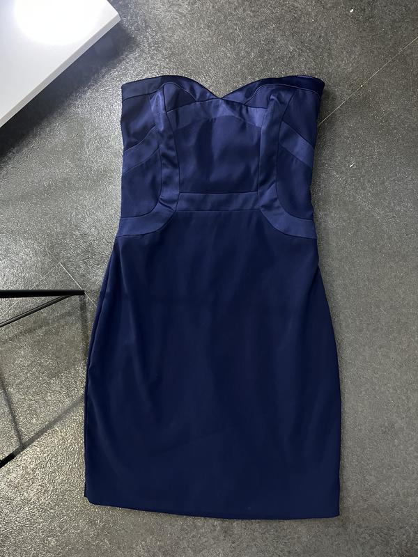Мини платье темно-синего цвета Размер XS, сзади открытая спинка, спереди имеет косточки в груди, за счет чего не будет сползать, бретелей не имеет Стан идеальный, замеры: длина 74 см, пог 36 см, пот 33 см, поб 41 см В жизни цвет немного темнее