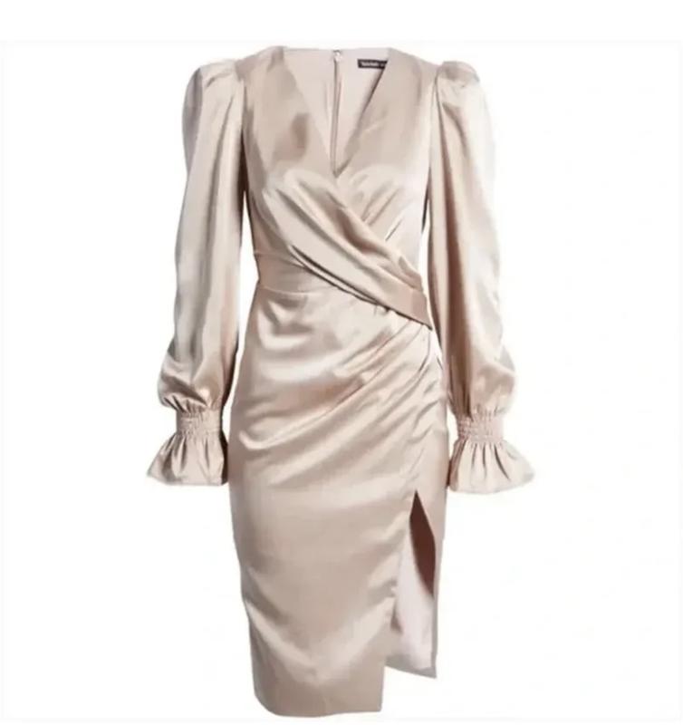Дуже гарна сукня , з сайту асос, розмір м, з біркою Є маленький нюанс, який я вказала на фото, ззаду маленька зачіпка імітація запаху спереду вільні рукави з манжетами на резинці підплічники блискавка ззаду мʼяка приємна тканина під сатин, шовк, атлас розріз на підкладці класичний крій для класичних форм Продаю так як не мій фасон Дуже дорого виглядає