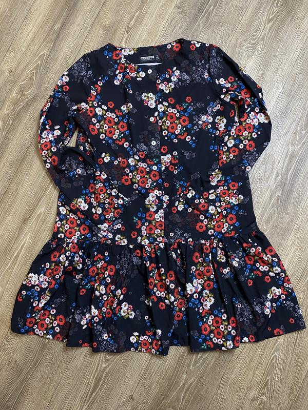 Гарна сукня з квітковим принтом. Спереду має заспібки на ґудзиках, на рукавах теж ґудзики на манжетах. Тканина легка, але не просвічується. Стан нової! Без дефектів!!! Розмір М Рукав 64 Плече 8 Пог 52,5 Пот 55 Поб 59 Довжина 91