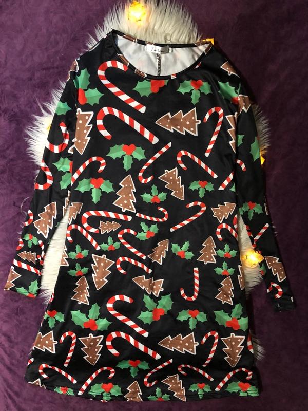 В Новогодний принт лёгкое, скользящее платье XL , рукав 61, плечи 40, шир.47, длина 95, сост.отличное- 220 грн.