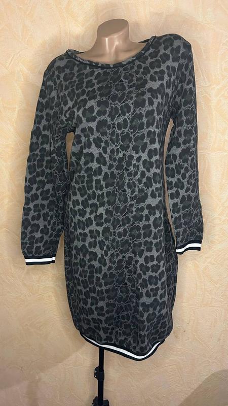 Принтованное платье - туника, в красивом состоянии. Размер 50-52. ЗАМІРИ ПОГ 50+8,ПОТ 48+8,ПОБ 52+8, ДОВЖИНА 98 см., низ по резинкі 45+5,довжина рукава 60 см.