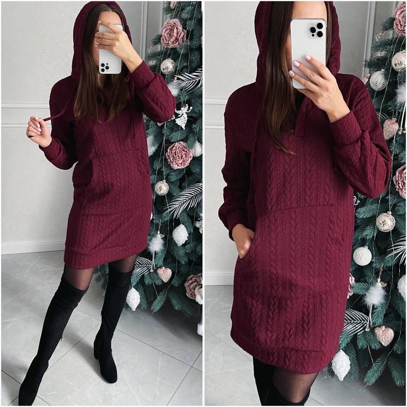 Модель 349.am Размеры 42/46, 48/52 Ткань стеганый теплый трикотаж, дизайн: Бордо коса, изумруд и черный ромб -кВеточки Теплое платье -кенгуру с капюшоном, рукава и низ манжет, впереди карман, удобный капюшон со шнурком