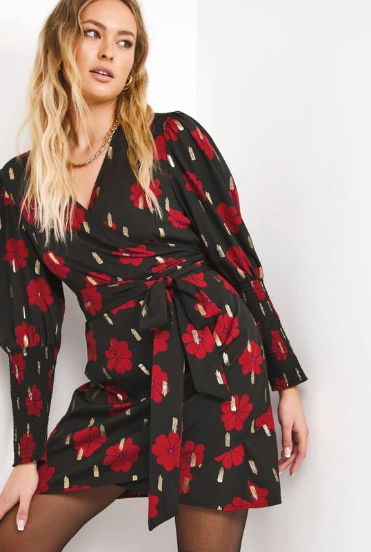 Черное батал мини-платье с запахом и цветочным принтом simply(размер 24-28)